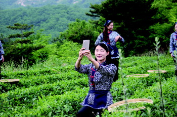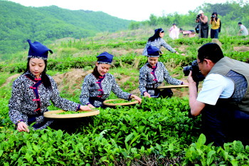 本报6月8日讯(记者 李超) 处处飘茶香、漫山飞茶歌,采茶女模特添风采。6月7日,由本报与沂源翠微有机高山茶联合举办的茶园摄影比赛举行,模特们身着蓝印花布衣服,表演了采茶、炒茶、泡茶等工艺,来自全省各地的十余位摄影师参加。