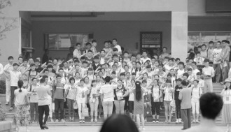 8日开考前,在三中西校考点内一个班的学生聚集在一起,共同呼喊“胜利属于我们”的口号,为自己加油打气。 本报记者 袁鹏 摄影报道