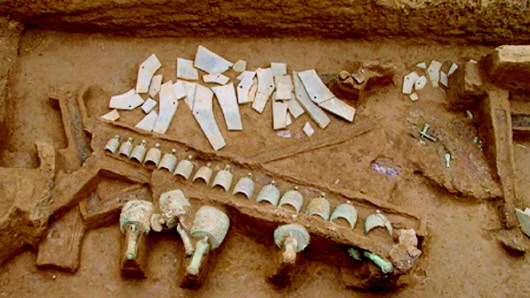 在3米宽20米长的乐器坑内,一共出土文物140多件,其中石磬有6套,大多保存完好,而且每个石磬上都有编号,这就为解决石磬排列和悬挂的顺序提供了重要参考。最神奇的是,19个保存完好的编钟,这些在地下埋藏了两千多年的文物一露出地面便发出闪亮的光芒,编钟外部雕刻的花纹也非常精细。因为这些编钟保存完好,经过轻轻擦拭便能打击出美妙的音乐,同时乐器坑内还出土了许多鼓类打击乐器和弹拨乐器。这些文物向我们生动地展示出了汉代宫廷乐队的宏大场面。