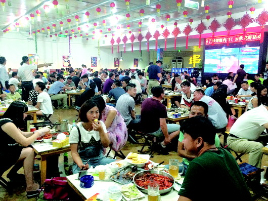 生产路附近一家大型龙虾店食客满堂。 本报见习记者 王小蒙 摄
