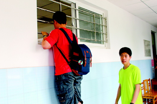 由于许多教室靠走廊的窗户都没关,很多家长利用这个“优势”,拿着手机往里伸着拍照,想拍清楚孩子桌上贴着的考号。还有人站在教室外将给学生准备的物品放置在桌上,探着身子往里看。甚至有个别家长为了确定究竟是哪个座位,让孩子从窗户里爬进了教室。