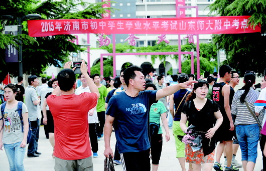 10日下午,众多家长带孩子看考场。图为父亲指示孩子看注意事项。 本报记者 周青先 摄