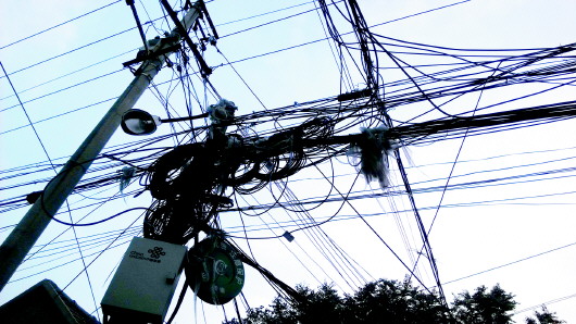 豆腐店村路边的电线杆上线缆乱如麻,一圈圈的电线上还缠绕着不少塑料布。