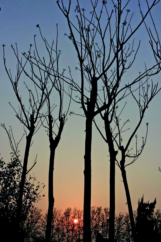 树是拔地而起的人,如我淳朴善良正直的祖辈,在皖北平原上,站成一座座我永远跨越不了的山。在我的字典里,“轰然坍塌”是最滑稽的词语,一棵树即使死去,也是站着死去,它们的躺下并非出于本意,似我的父亲,即使重病缠身,也苦捱到麦田里,查望墒情,与乡人会商农事。