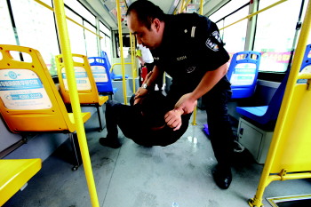公交车上一男子突然情绪激动,拿出不明液体向车内泼洒,并试图劫持公交车,驾驶员紧急停车后,立即疏散乘客并报警,民警及时赶到迅速制服该男子……10日,李沧公交363路队联合公安部门,对公交行驶途中遭遇劫持等情况进行了应急演练,民警向100余名驾驶员讲解了基础防身术及突发事件处置技巧。
