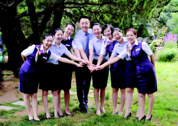 “面向大海”即员工以“心怀感恩”的服务理念出发,如大海博大的胸怀、容纳百川,接待着走进麦岛的每一位客户,支行的地理位置又恰好“面向大海”。“次第花开”则求得是服务最高意境,即让客户对支行“流连忘返”,赢得一位位客户的“心”,求得“满园春色、一朵朵心花怒放”的服务境界。