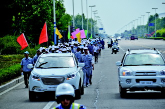 300余名荣成华泰汽车有限公司的员工统一着装,头戴蓝色和白色的鸭舌遮阳帽,各大车间和部门的员工组成了整齐的方队,各自举着印有华泰汽车LOGO的旗帜开启了此次低碳环保徒步行之旅。8时30分,参加徒步行的员工们集合完毕,由两辆警用摩托车带路,一辆华泰新圣达菲A25和一辆圣达菲打头阵,引领徒步行队伍从荣成泰通汽车销售公司准时出发。