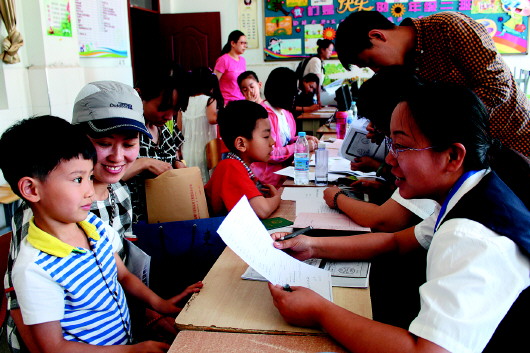 13日上午,东方双语开元校区,家长带着孩子现场提交入学报名材料,由工作人员进行审核。