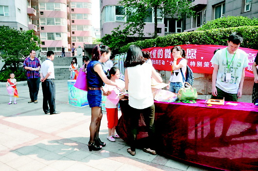 6月1日当天,中创开元山庄社区和谐广场上,社区居委会组织儿童、青少年、大学生作为志愿者,现场发放宣传单,让更多的社区居民加入此次活动中来,希望借助大家的爱心来帮助困难儿童。