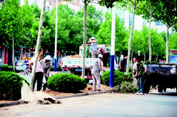 6月14日,由于湖滨大道上的部分绿化苗木老化,施工人员对枯死苗木进行清理,对绿化带进行更新整形。 本报记者 马志勇 摄