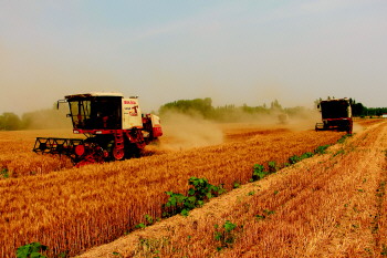 今年,临盘街道8万亩小麦均采用加装粉碎装置的小麦联合收割机收割,减少了第二次粉碎对耕地的碾压,杜绝了焚烧污染,秸秆还田还对土地起到增加肥力的作用,大大提高了机械化收获能力。图为临盘街道年丰粮食种植专业合作社组织的加装粉碎装置的联合收割机在收割小麦。