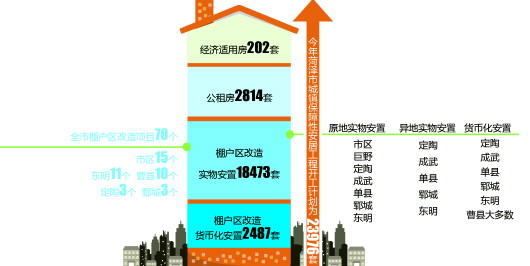 今年菏泽市城镇保障性安居工程开工计划为23976套,其中经济适用房202套,公租房2814套,棚户区改造实物安置18473套,货币化安置2487套。