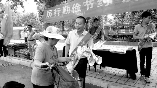 15日,机关事务管理局的工作人员在中华路上开展节能宣传活动。 本报记者 张建丽 摄