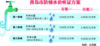 15日,青岛市物价局召开市内三区居民用水价格调整和建立阶梯价格制度听证会,就居民用水价格调整和建立阶梯价格制度的必要性和可行性进行了公开听证。根据听证方案,阶梯水量设置为三档:第一阶梯年用水量120立方米以内(含),覆盖87.96%的居民用户;第二阶梯年用水量120—204立方米(含),覆盖97.82%的居民用户;第三阶梯年用水量204立方米以上。