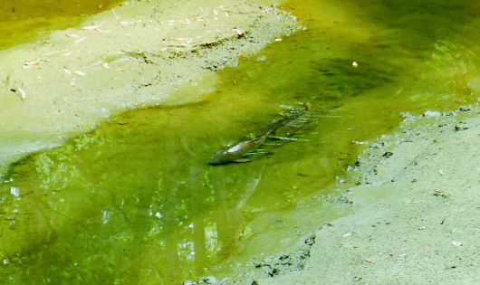 它奋力挣扎上溯,游过四五十米的艰难路途后,进入一丛水葫芦。在这更浅的水里挣扎一番后,渐渐平静,进入生命的最后阶段。 十几名游客目睹这条鱼的悲情逃生路,大家加油鼓劲,但因为距离太远、淤泥太深,就连景区工作人员也爱莫能助。泉水濒临枯竭,鱼类比人类更加渴望清泉复苏。