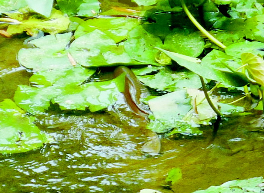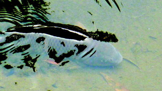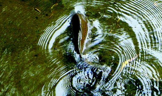中午时分,这条近40厘米长的大鲤鱼又开始了一次逃生之路。它本能地循着来水的方向,向上游迁徙。开始还有几条小鱼跟随,后来水越来越浅,小鱼们胆怯回头,只有它自己继续在泥水里往上游挣扎,沿着狭窄的河沟曲折向西。结果水越来越浅,它的脊背已经露出水面。