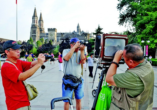 21日,济南洪家楼广场,来自天津大画幅俱乐部的摄影师们,正在操作8x10大画幅老式照相机拍摄济南的老建筑。他们这些重量级的传统拍摄装备一亮相,围观的人们也纷纷用单反数码相机,小数码微单和手机对他们一阵狂拍。一时间,形成有趣的摄影历史的大穿越。 本报记者 徐延春 摄