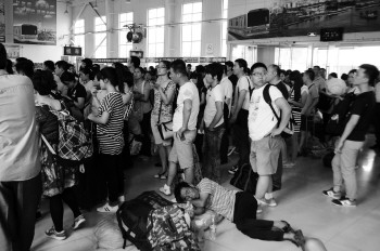 6月22日,德州火车站迎来端午假期返程高峰,发送旅客过万人。在候车厅,一旅客在等待检票的空隙躺在地上睡着了。 本报记者 马志勇 徐良 摄影报道
