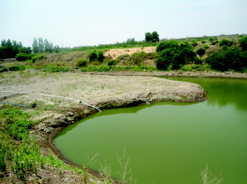 即墨一处河塘干成了水洼,露出的河床上长出了青草。 宋祖锋 摄