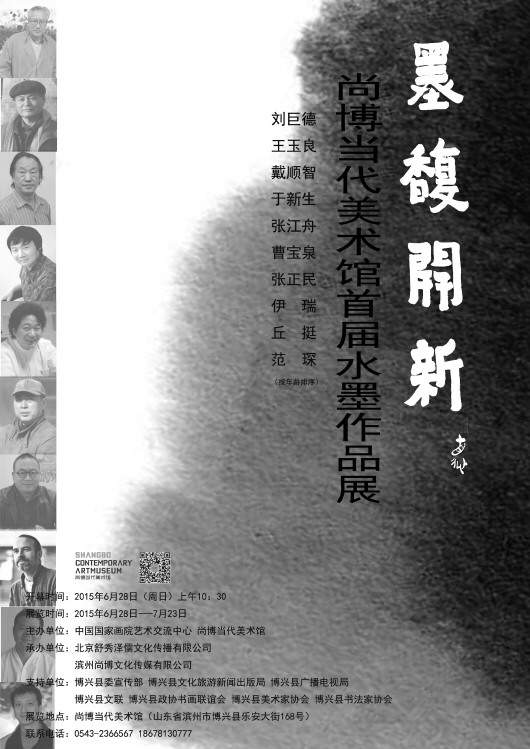 由中国国家画院艺术交流中心、尚博当代美术馆主办,北京舒秀泽儒文化传播有限公司、滨州尚博文化传媒有限公司承办的墨馥开新--尚博当代美术馆首届水墨作品展将于2015年6月28日上午10点30在山东省滨州市博兴县尚博当代美术馆开幕,本次展览受到博兴县委宣传部、博兴县文化旅游新闻出版局、博兴县广播电视局、博兴县文联、博兴县政协书画联谊会、博兴县美术家协会、博兴县书法家协会等等的大力支持,本次展览也是尚博当代美术馆的开馆展览。