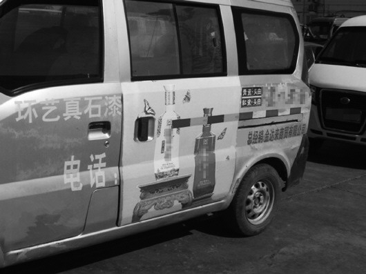 18日下午,沾化区的吴某驾驶一辆面包车到沾化公安分局交警大队车管所进行年检,面包车的车头是原本的银白色,车门上却贴上了彩色广告,后半截车身也印上了品牌宣传和经销公司的内容。吴某说,自己在车上贴上广告,就是为了能随时随地做宣传。