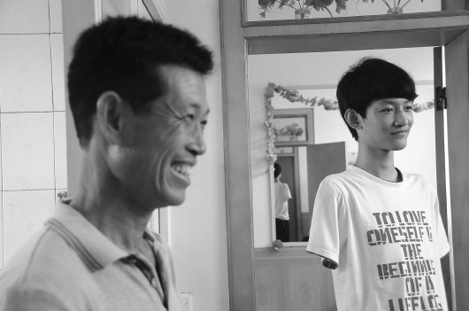 对于王海港(右)的这个考分,父亲很满意。 本报记者 孙国祥 摄