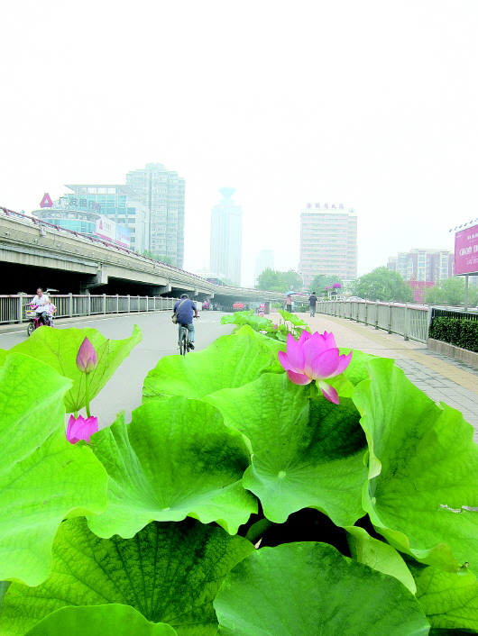 初开的荷花与路边绿树交相辉映,在雨后的街边格外清新。“坐着车就能赏荷花,看着街边或红或绿,感觉心情也变好了。”一位市民说。