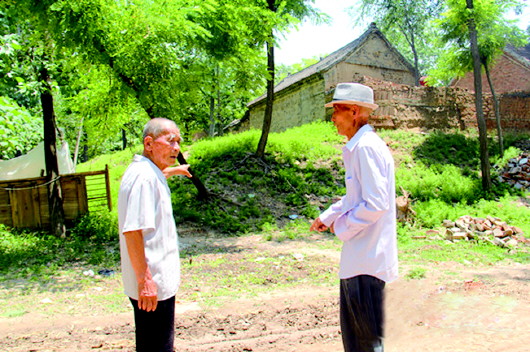 90岁的张新轩(左)和82岁的杨玉金在王厂战斗遗址现场。