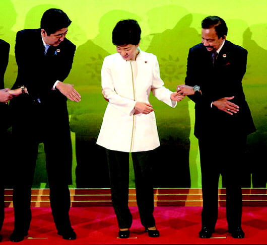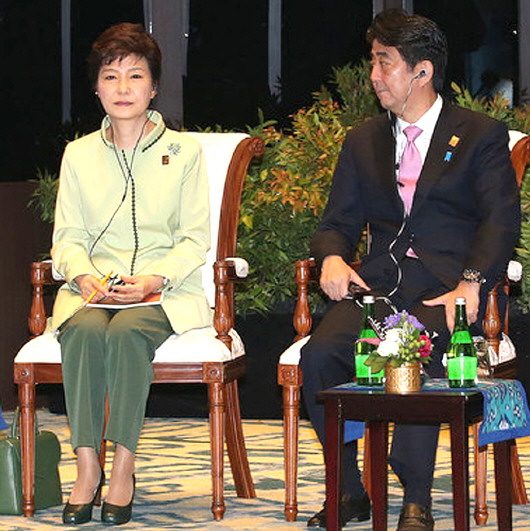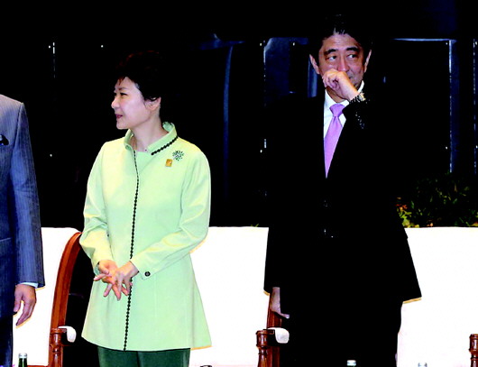 2013年10月,APEC领导人非正式会议在印尼巴厘岛举行,朴槿惠与安倍相邻而坐,但却全程没有任何言语或眼神交流,安倍曾试图打破僵局,但朴槿惠一脸严肃,丝毫没有给安倍搭腔的机会。那次会议的领导人交叉牵手环节上,两人又相邻而站,在与安倍牵手与否上,朴槿惠有过犹豫,但最终碍于会议程序,她被迫与安倍牵了一次手。