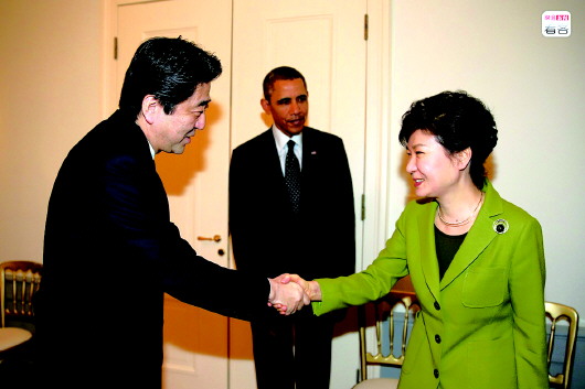2014年3月,荷兰海牙美日韩峰会,首次正式握手也是迫于压力。