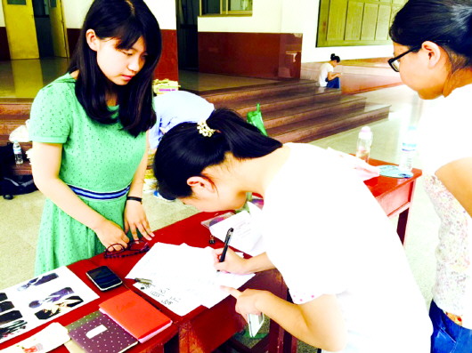 在捐书摊位前,“高颜值”学霸葛文(左一)招呼同学们登记捐书信息。 本报见习记者 周国芳 摄