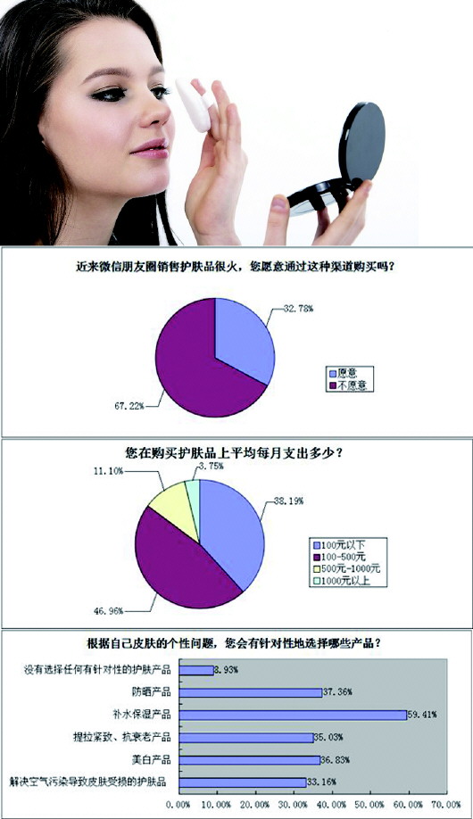 针对“根据自己皮肤的个性问题,您会有针对性地选择哪些产品”的调查,结果显示补水产品最受青睐,选择人数占到了59.41%;选择防晒、美白、提拉紧致、抗衰老产品的人数也都占到了35%左右。有33.16%的消费者表示会选择“解决空气污染导致皮肤受损的护肤品”。