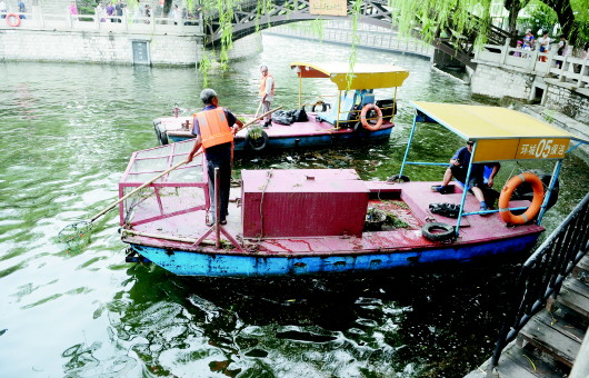 28日,在护城河内,工作人员用船只清理河道的水草和漂浮垃圾等污物。随着天气日渐炎热,河边的游客数量大增,垃圾量也随之增加,爱护泉水可谓人人有责。 本报记者 周青先 摄