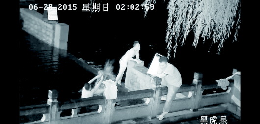 本报6月28日讯(见习记者 唐园园 通讯员 聂晶) 黑虎泉的三个兽头刚刚全部复涌不到一天,28日凌晨2时,两名男子在明知道泉池内禁止游泳的情况下,借着酒劲,三五下脱了衣服下到泉池中。景区执勤安保人员发现后,按相关规定对两人进行了罚款和口头警告。