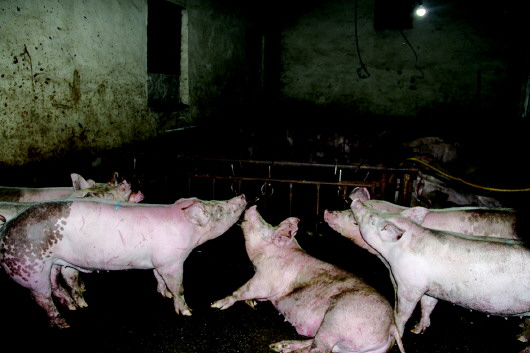双头铁钩一头钩住猪上颚,一头挂在铁栏杆上,一根胶皮软管插进猪胃里灌水,这样最多能让一头猪增重50斤。灌水后的猪整个身体如同气球一样,甚至无法站立。近日,济南槐荫警方捣毁两处涉嫌非法经营的生猪屠宰加工黑窝点。