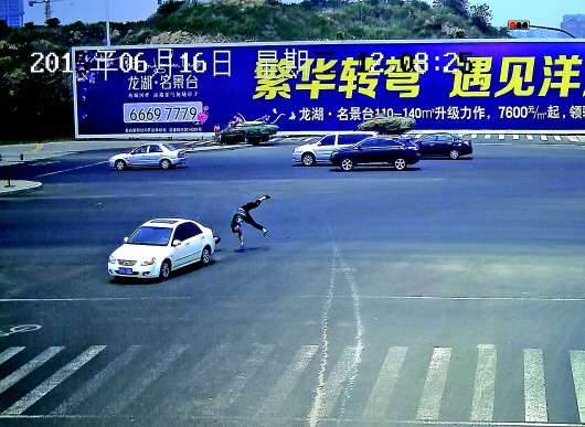 监控视频显示,事发的时间在当日的12点08分,当时小伙子驾驶摩托沿青岛路由西向东直行,在青岛路东营路十字路口与白色轿车发生撞击。撞击致使小伙子在空中翻了一个跟头,身体接触地面后,又翻了一下才坐倒在地上。