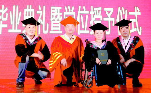 26日,经过在齐鲁师范学院美术学院四年的大学生活,“玻璃女孩”窦升建迎来了毕业典礼。当她上台时,校长王玉华、副校长刘德增、美术学院院长李广平俯下身,环伴在她的轮椅旁合影留念。