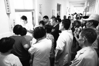 候诊病号挤满了朐山医院的走廊。 本报记者 呓飞 摄
