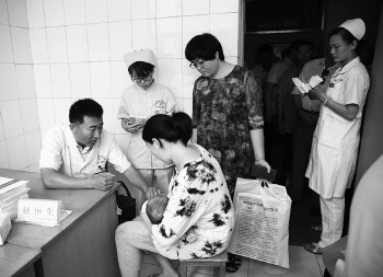 专家细心为患儿做检。 本报记者 呓飞 摄