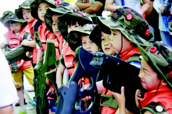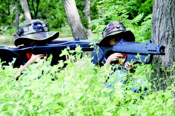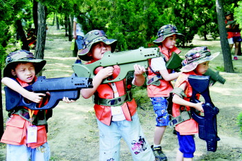 比赛开始了,我们队队员们分布在林子的每一个部位,只要对方敌人一出头,全体队友就会疯了一般地射击,然后迅速将自己隐藏起来躲避对方的子弹。两队队员都很卖力的攻击对方,只听枪声“啪啪啪啪……”响彻整片树林,打得太激烈了。我们越来越有经验,也越来越清楚我们的地形,大家都小心地注视着对方。突然听到对方敌人大喊了一声:“不好我被射死了!”另一个人走过去看了一眼,也被我们打了许多枪,惨叫声接连不断。只剩5分钟了,大家头上都冒出了汗水,都抓着枪拼命的打,忘记了炎热,玩得不亦乐乎。