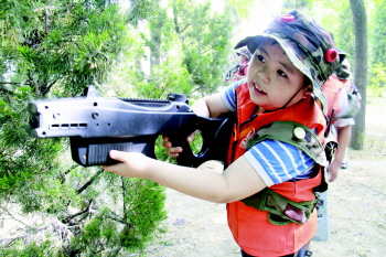 星期六一大早,我就到了野战基地集合,万分激动地等待着游戏的开始。现场是一片一片的小树林子围着我们,令我感到了有些神秘感。教练让我们分成两队,穿上了迷彩的背心,戴着有装置的帽子,给了我们每人一把冲锋枪。我们一个个精神抖擞,整装待发。教练给我们说了一些注意事项,教我们怎样拿枪,装子弹,然后就打开了控制器,告诉我们说:“每个人只在五条命,一定要好好珍惜哦!”