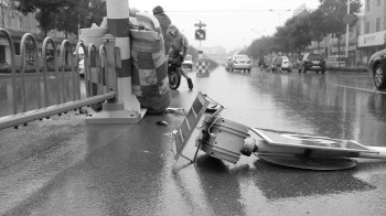 6月29日,禹城迎来降雨天气。上午11时50分许,在禹城市禹王路前河套社区附近,道路中央的反光锥筒和太阳能反光板等交通设施被撞毁,肇事车辆已经不在现场,现场仍存有肇事车辆损毁的碎片。