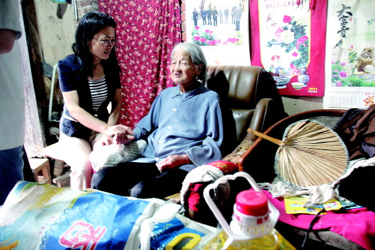 ◤拉着副县长刘芸的手,91岁的老人十分激动。 本报记者 周千清 摄