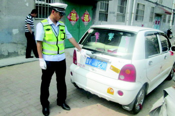 29日上午8点,黄岛公安分局交警大队民警巡逻时,发现对面开来的一辆奇瑞轿车突然加速,这一举动引起了民警的注意。警车掉头一路跟随该车至一居民楼下,该车停稳后,民警上前要求驾驶员出示相关证件。这时,火眼金睛的民警发现该车的车牌上数字“6”与号牌背景色有轻微的差别,用手一揭,露出了车牌上的数字“9”。此时,该车驾驶员也找出了相关证件。经查询,该车本身的号牌应是V××9××,车主的行为属变造机动车号牌。