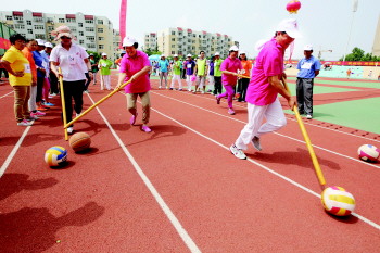 28日,在青岛枣山小学,2015年李沧区“公益体彩区长杯”全民健身暨浮山路街道“欢动浮山,悦享生活”社区趣味运动会开幕。比赛包括地滚球击瓶、脚踏实地、快乐大脚、赶猪跑、大力士、套圈、精打细算、袋鼠运瓜等项目,辖区600多人参赛。 本报记者 张晓鹏 摄影报道