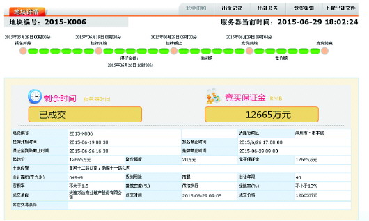 29日上午9:08,滨州市公共资源交易中心成交公告显示,大连万达商业地产股份有限公司获得滨国土资告号2015-X006地块,成交金额1.2665亿元。 (官网截图)