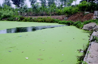 ▼在刘庄村大桥附近的池塘内,管口流出的污水冲出了明显的一片痕迹。 本报记者 孙越 摄于6月29日