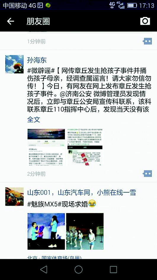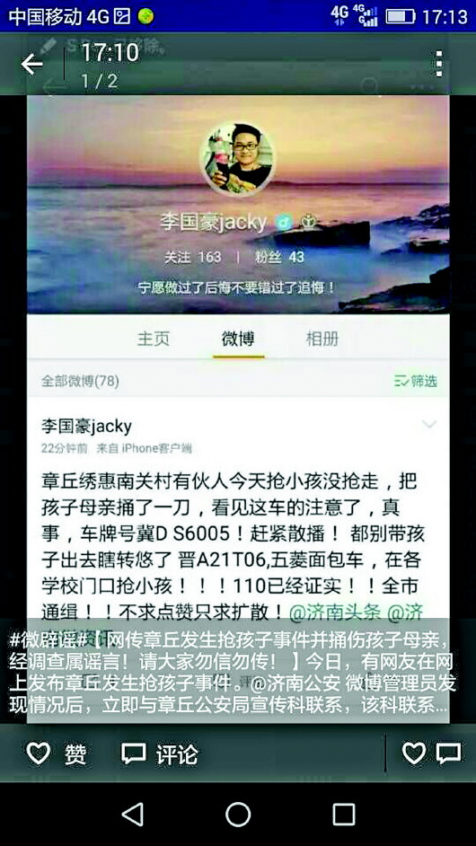 章丘一网友散布抢孩子谣言。