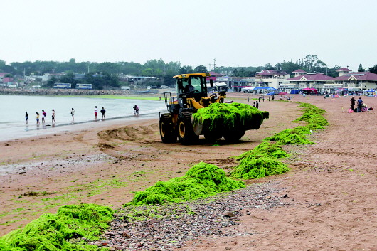 铲车正在清运浒苔。 本报记者 杨广帅 摄