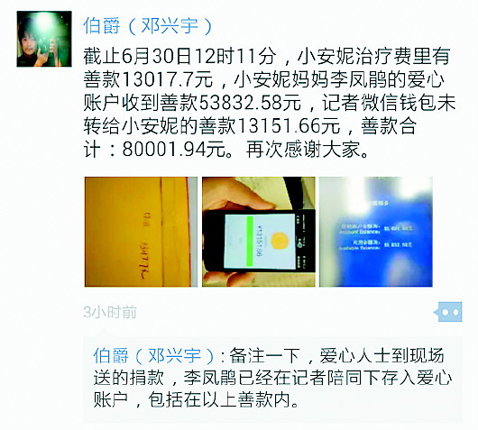 考虑到小安妮已经花费医疗费3万余元,目前筹集到善款8万元,另外一些爱心组织也已经为小安妮募捐到4万元,只是还未送到。6月30日晚上我发布了停止微信捐款的消息,所有善款微信红包和转账不再领取。募捐渠道只通过李凤鹃的银行账户汇款,捐款接受记者监督。